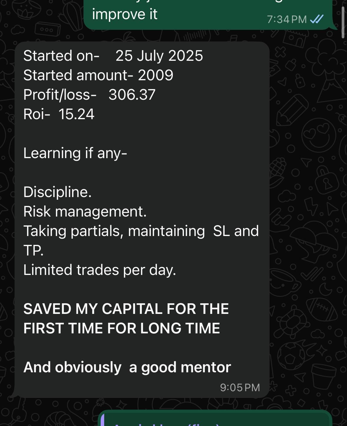 I am now dedicated to sharing this approach with others. In a market where new traders often blow their accounts in less than 60 days, my mission is to change that statistic. My one-on-one mentorship is built to help you protect your capital first, so you can build a sustainable career, not just another short-lived account. I provide the tools, the psychological guidance, and the personal mentorship to help you avoid the common pitfalls and achieve consistent, long-term results.